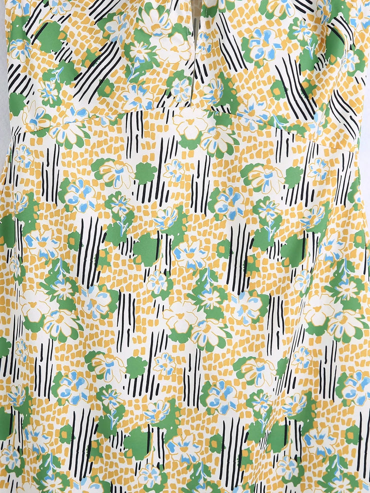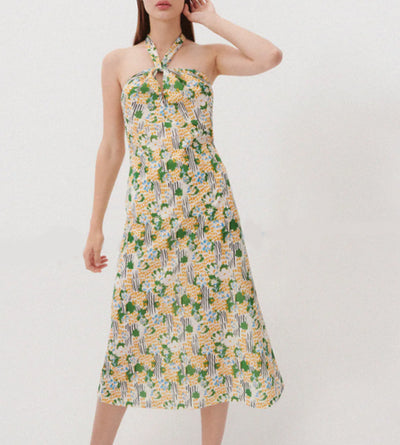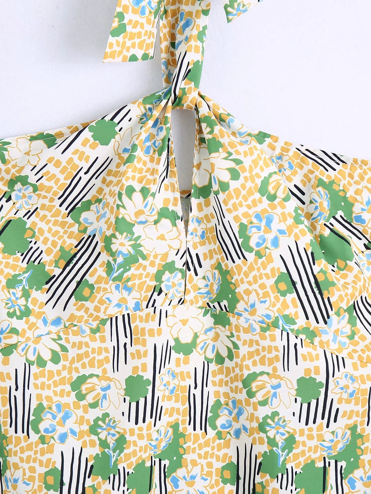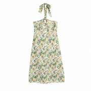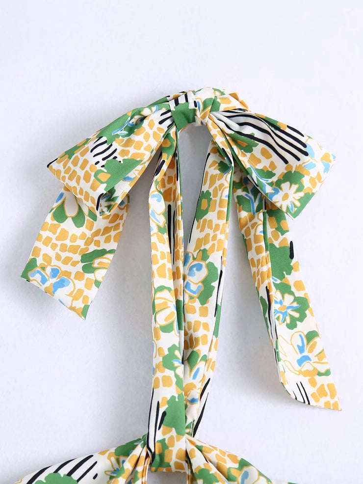 zara floral print halter sexy dress bow tie neck hollow out cute long summer casual dress