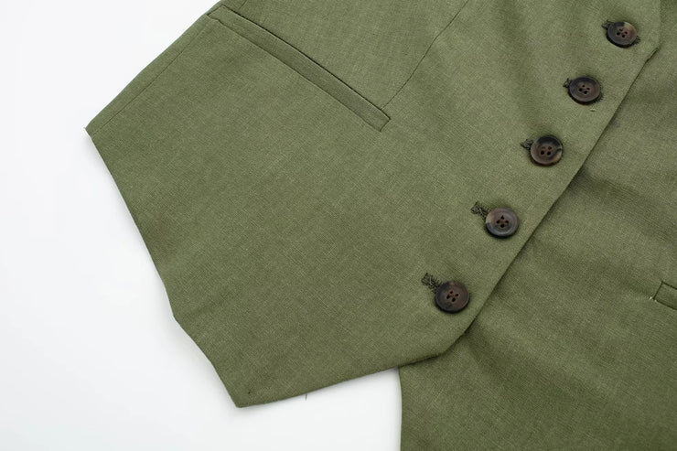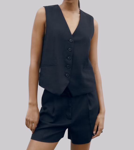The waistcoat vest set trend is here to stay. This matching vest and short set is one of our best-sellers